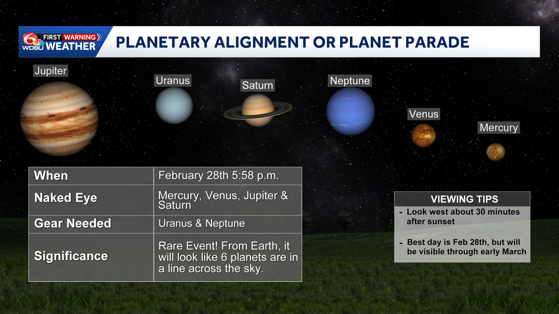 On February 28th we'll have the chance to see something really cool will happen in the night sky!Some of the planets in our solar system will look like they are lining up in a row. This is called a Planetary Alignment or a "Planet Parade."What Does "Li...